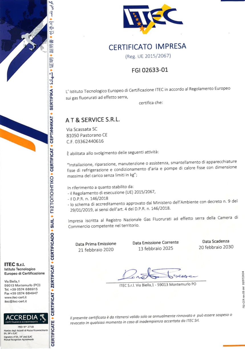 - Servizio di manutenzione e riparazione di apparecchiature di refrigerazione, condizionamento d’aria e pompe di calore, contenenti gas fluorurati;